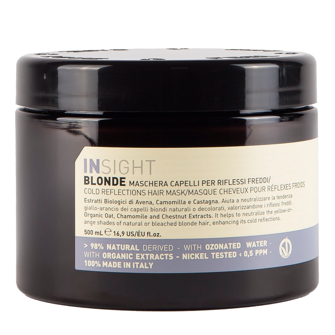 Primera regla del Club Blonde: después del champú se utiliza la Mascarilla capilar para reflejos fríos, un potente aliado para nutrir e hidratar el cabello rubio natural o decolorado y combatir los reflejos amarillo-anaranjados. Ideal para utilizar después del Champú Iluminador de la línea Blonde o en combinación con otro champú Insight. Esta mascarilla ayuda a disciplinar el cabello y a dejarlo suave y brillante. Su fórmula avanzada mantiene tu cabello rubio brillante y sin tonos indeseados.
